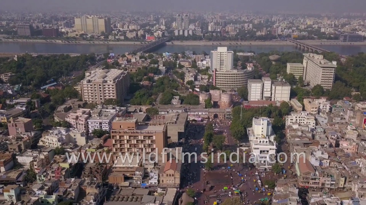 See the crowded old part of Ahmedabad city in Gujarat, with much traffic on the roads, and multiple residential units in layers. The Sabarmati waterfront in the backdrop if very much more organized.
